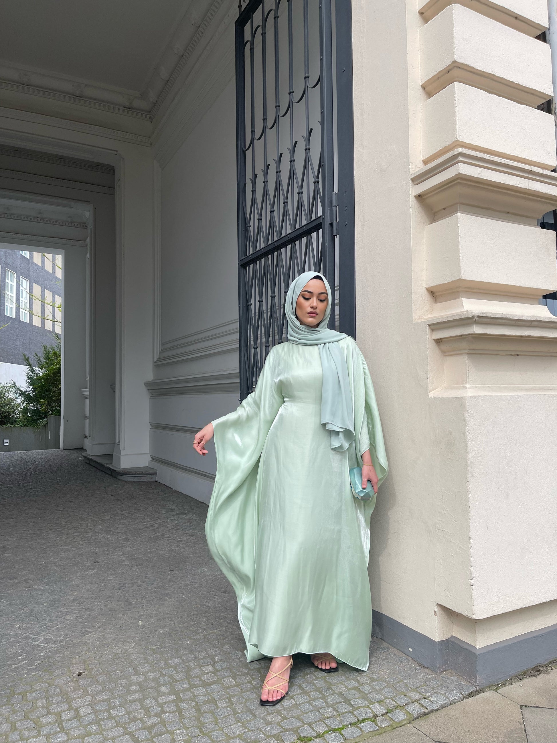 Diese Abaya bietet eine Einheitsgröße, die für Größen 36 bis 42 geeignet ist. Das Model auf dem Bild ist 1,71 m groß und trägt Größe S. Die Abaya hat eine Länge von 135 cm und verfügt über ein Detail an den Fledermausärmeln. Zudem ist ein integrierter Taillenband vorhanden, der eine individuelle Anpassung ermöglicht.