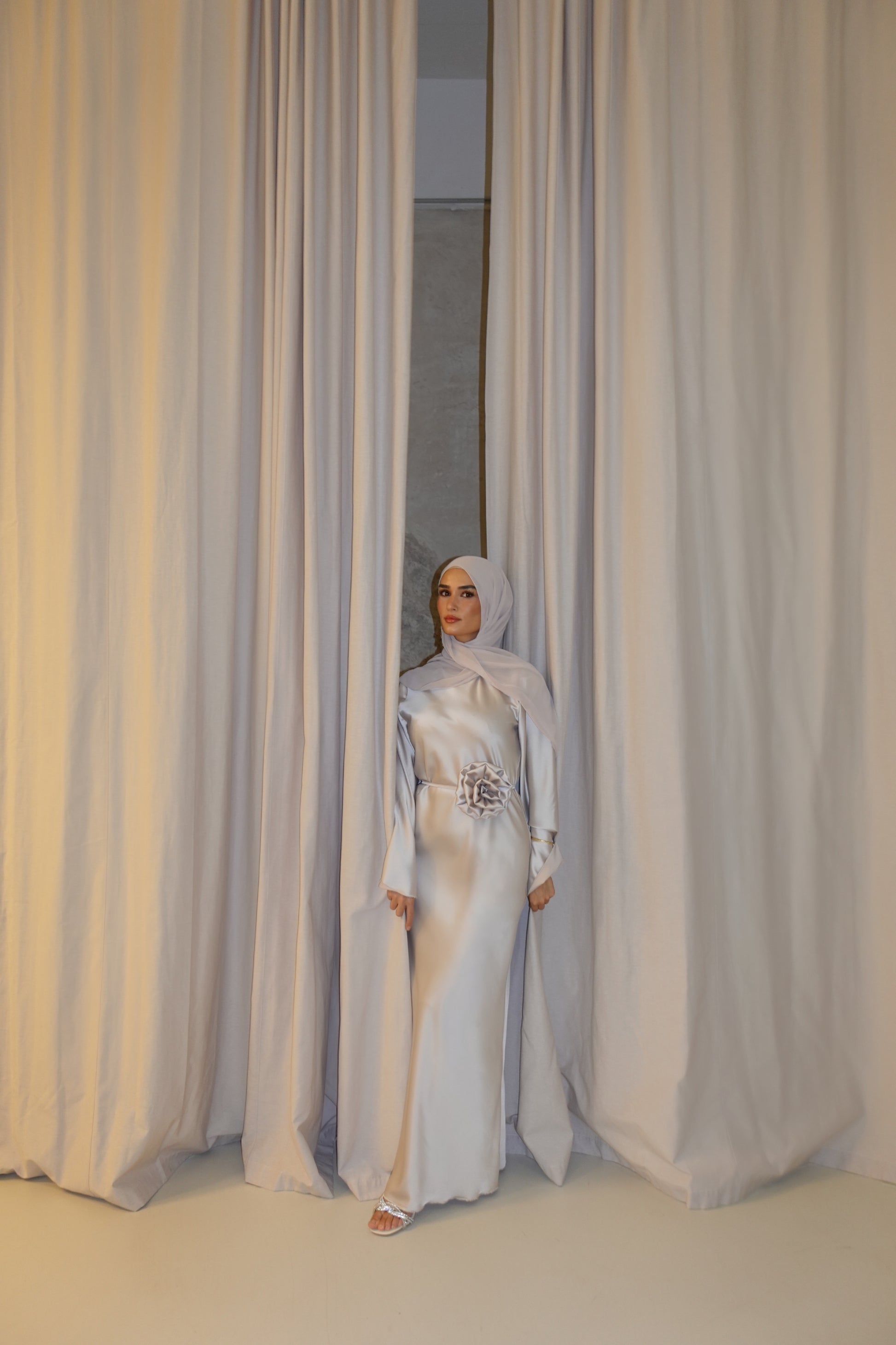 Dieses 140 cm lange Kleid vereint zeitlose Eleganz und modernen Stil. Der schimmernde Satin-Stoff und der romantische Blumengürtel betonen die Taille und verleihen eine feminine Note. Mit Größen von 36 bis 42 tragbar, bietet es perfekten Komfort für festliche Anlässe wie Hochzeiten, Eid oder Abendveranstaltungen. Ein Must-have für stilvolle Auftritte!