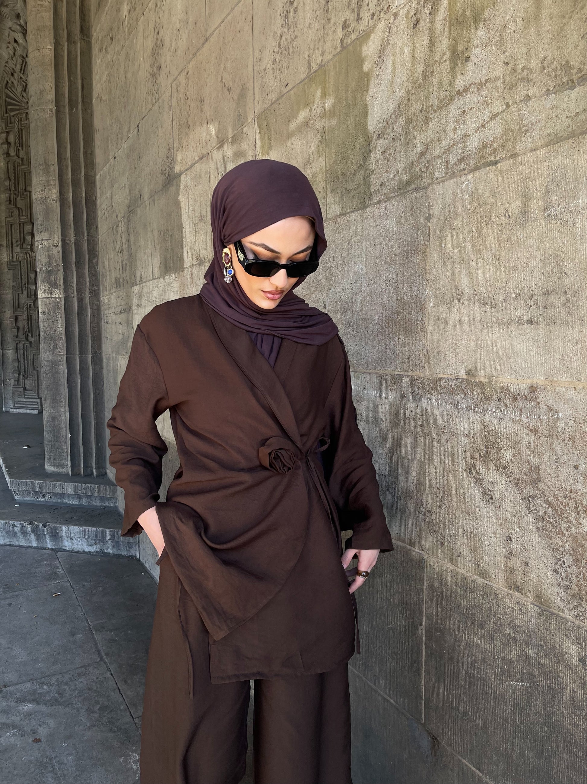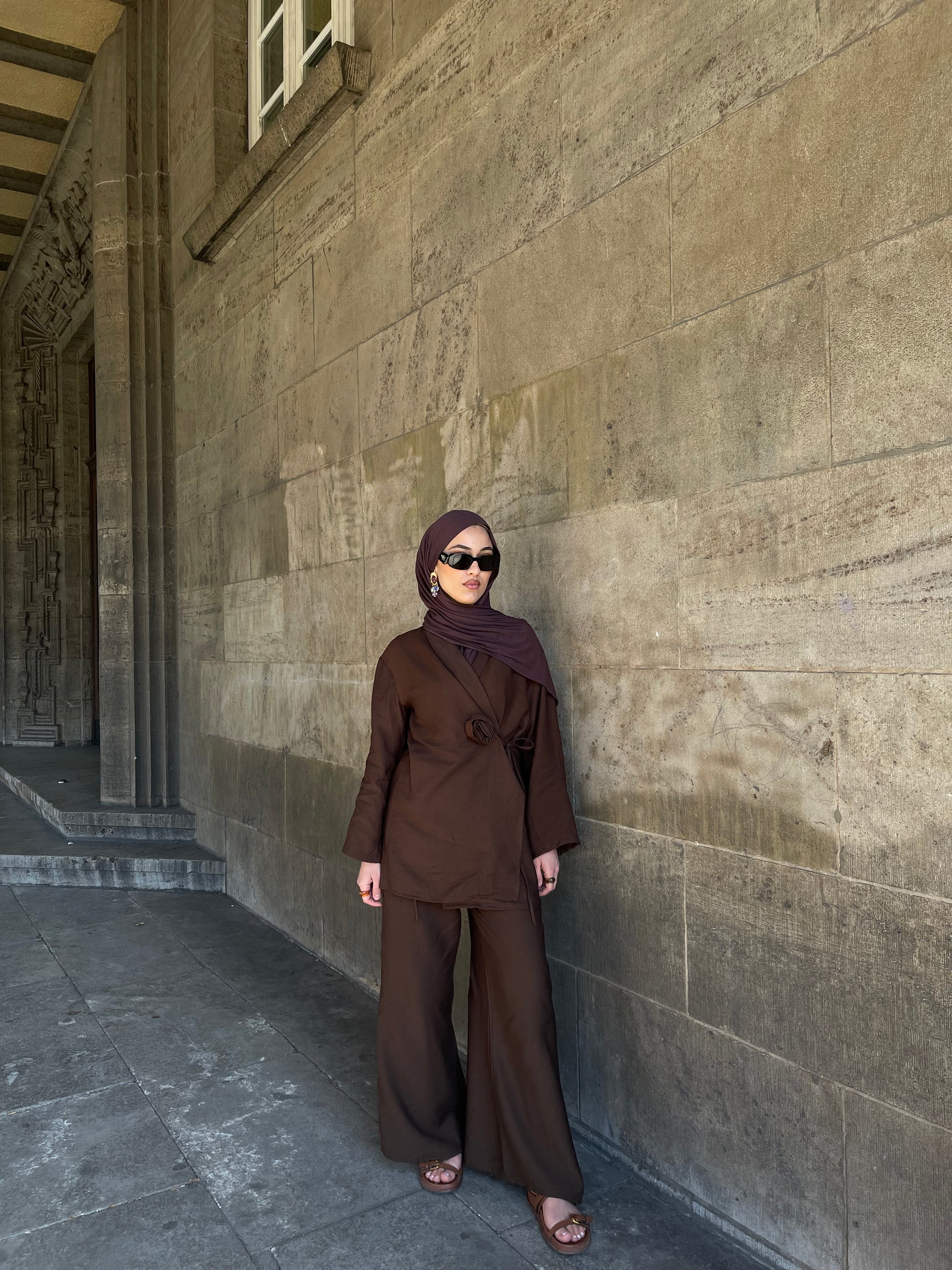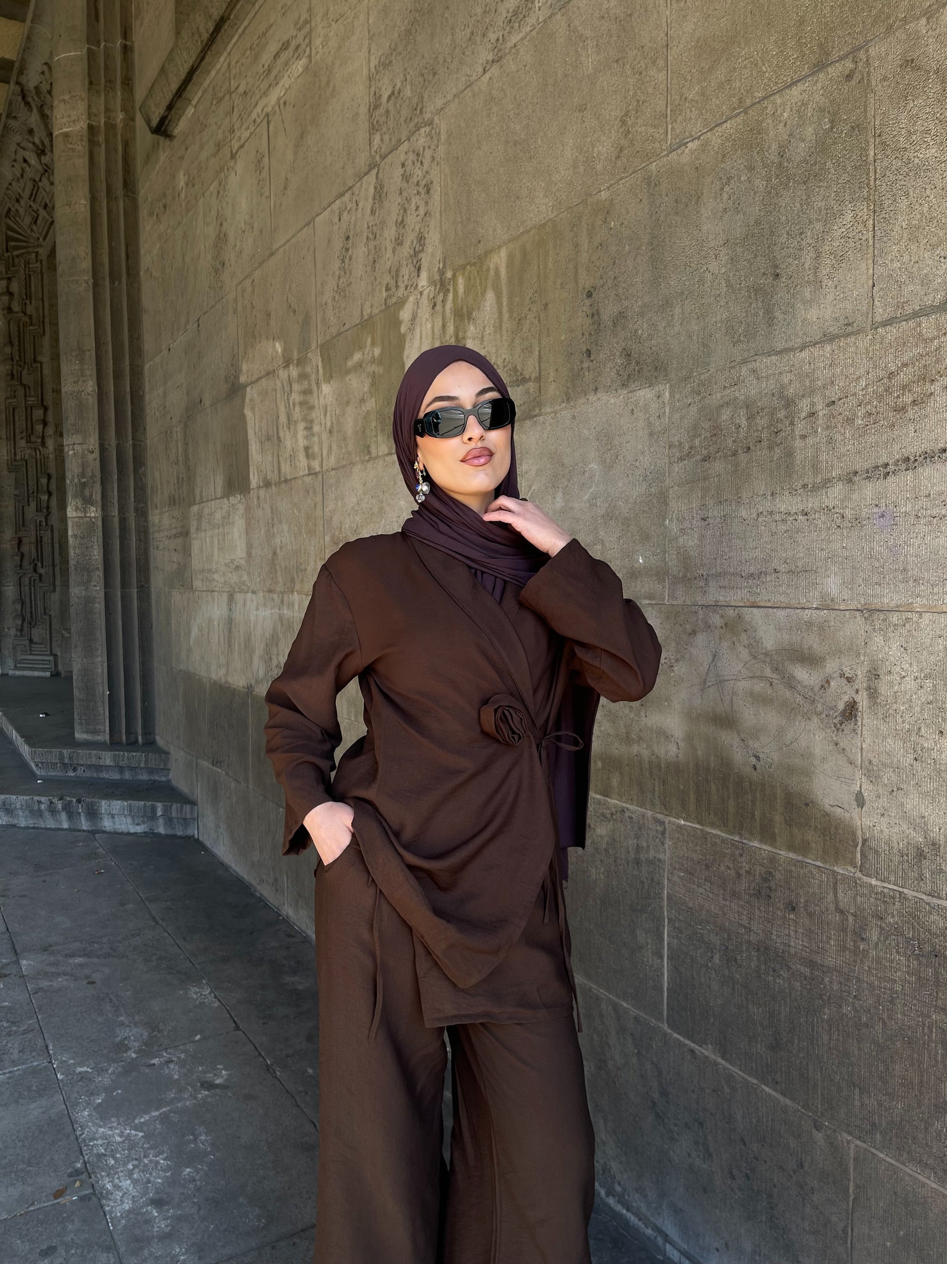 Ein femininer Zweiteiler, der durch sein zartes Blumendetail auf der Vorderseite alle Blicke auf sich zieht. Das Set besteht aus einem leicht fallenden Oberteil mit schmeichelhafter Länge und einer weit geschnittenen Hose mit elastischem Bund – für optimalen Tragekomfort und Bewegungsfreiheit.