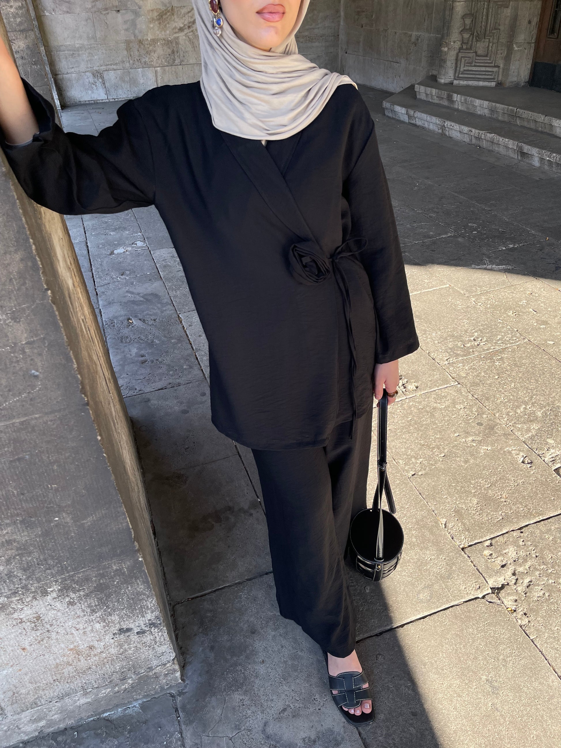 Ein femininer Zweiteiler, der durch sein zartes Blumendetail auf der Vorderseite alle Blicke auf sich zieht. Das Set besteht aus einem leicht fallenden Oberteil mit schmeichelhafter Länge und einer weit geschnittenen Hose mit elastischem Bund – für optimalen Tragekomfort und Bewegungsfreiheit.