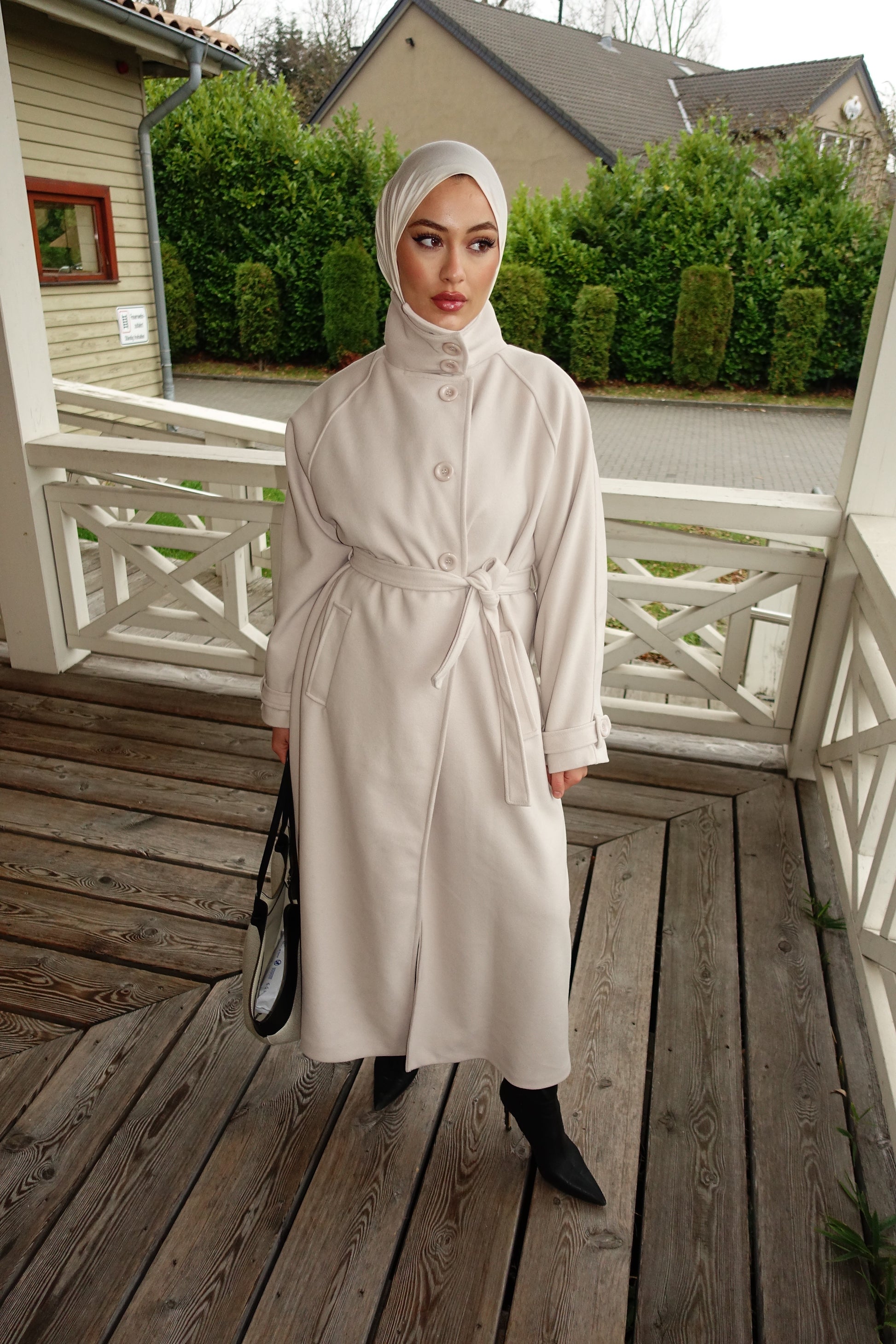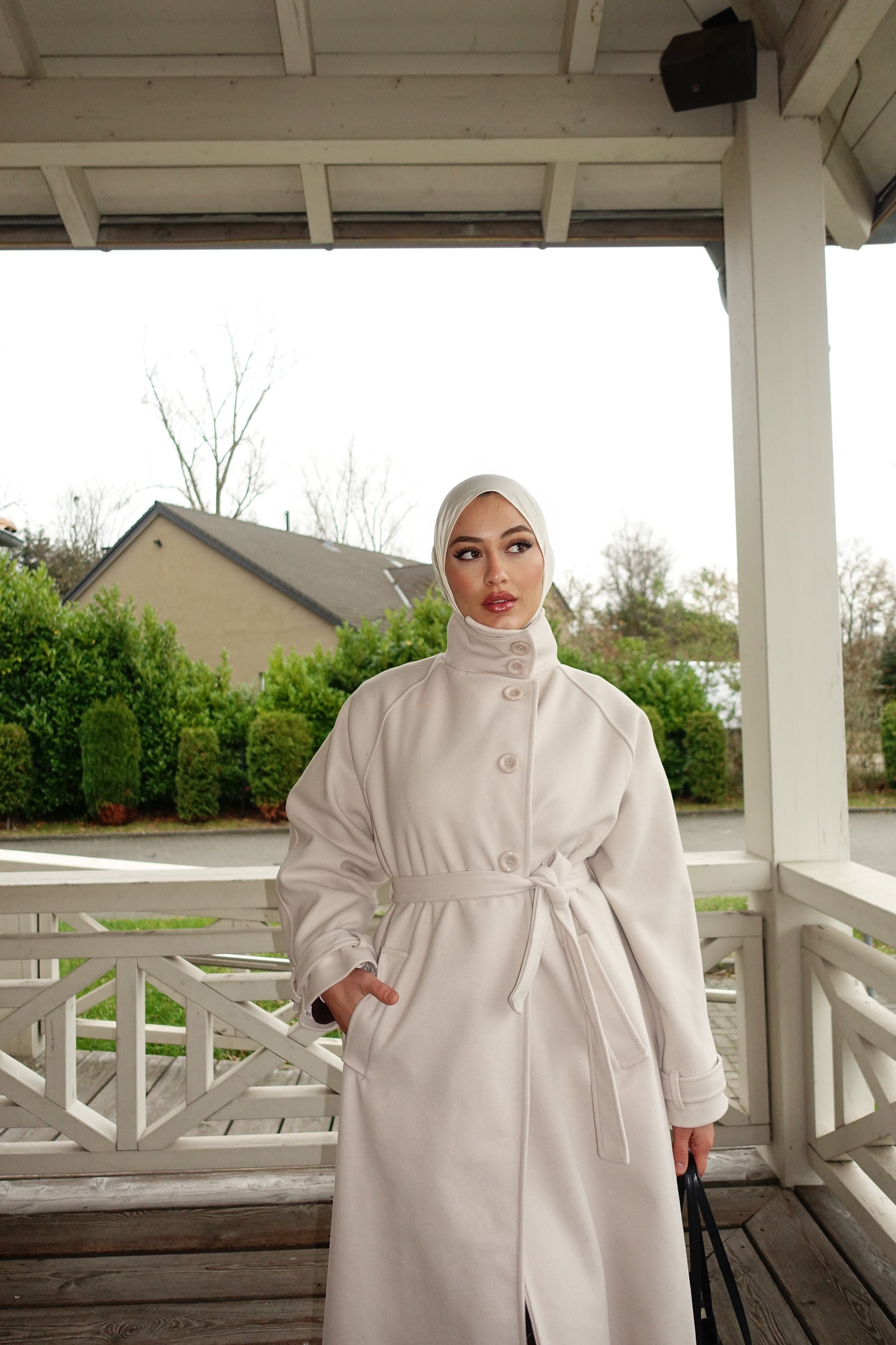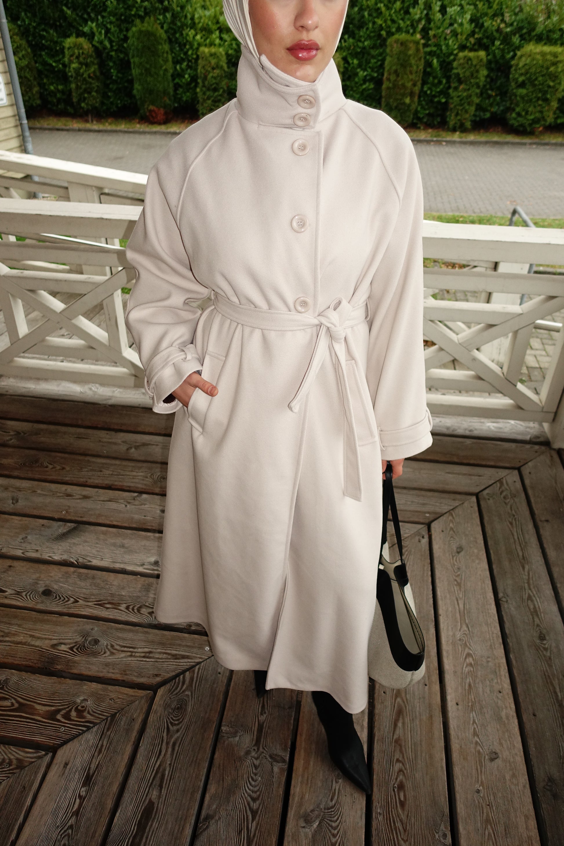 Mit hohem Kragen, Knoten-Gürtel und tiefen Taschen wirkt der Mantel modern, edel und sehr clean.
