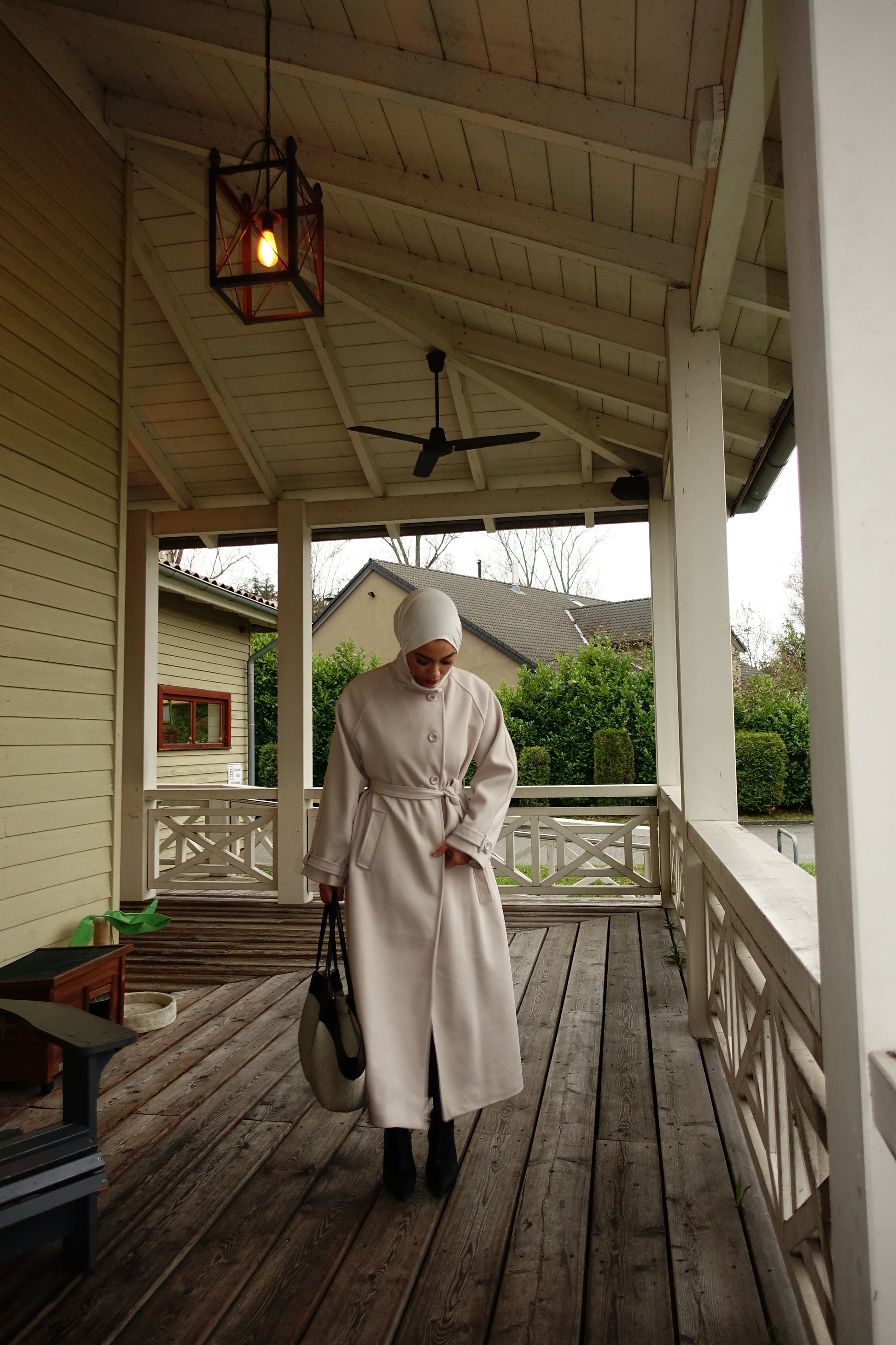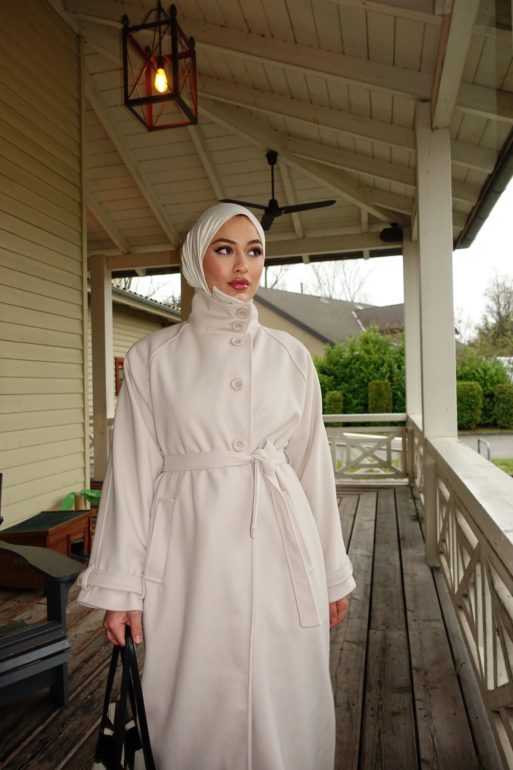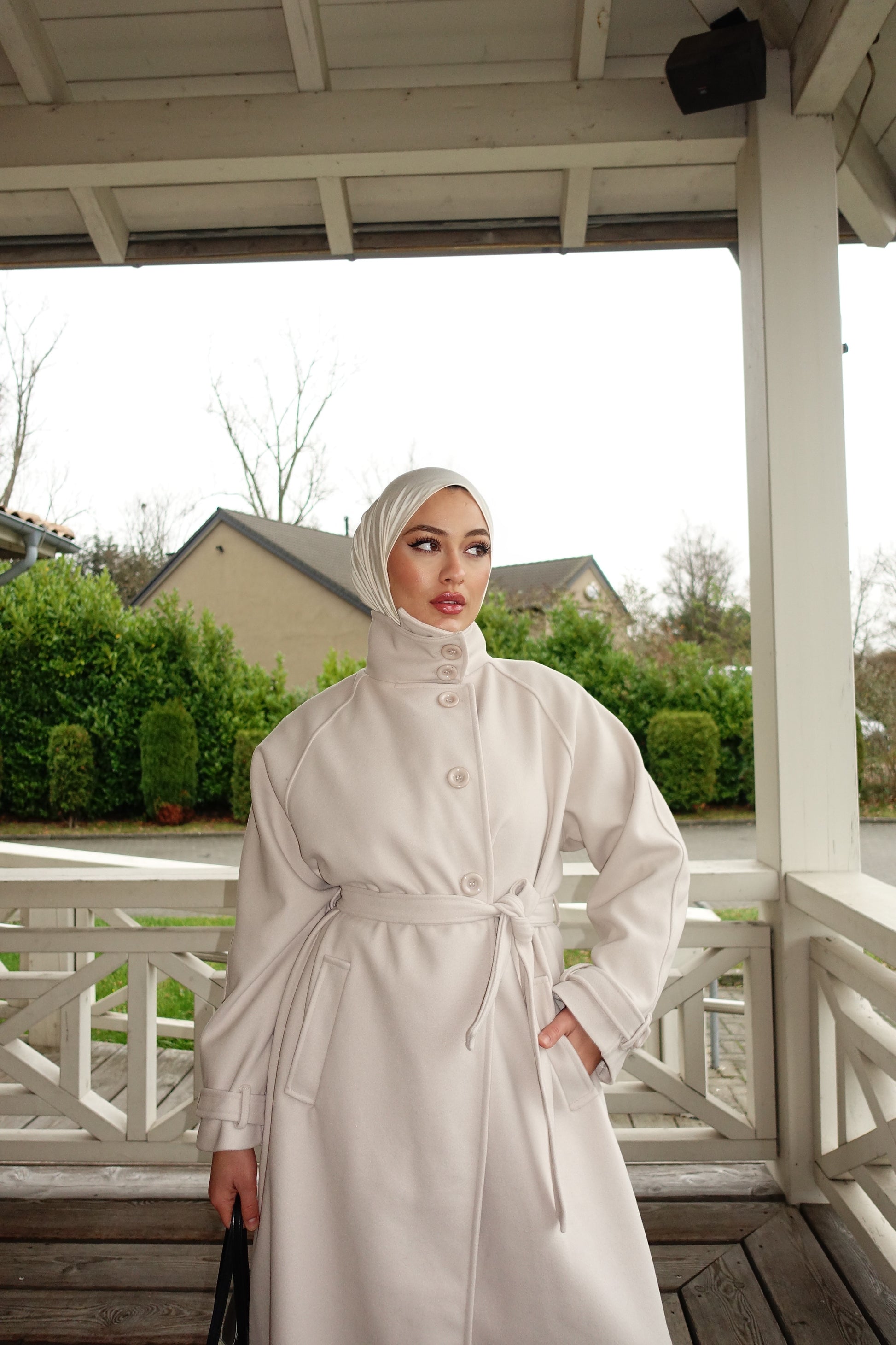 Mit hohem Kragen, Knoten-Gürtel und tiefen Taschen wirkt der Mantel modern, edel und sehr clean.