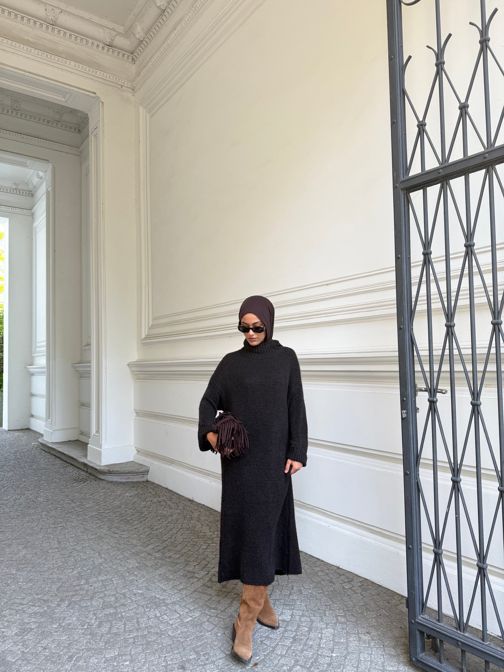 Dieses Kleid misst 130 cm in der Länge und ist in Einheitsgröße für 36–42 tragbar. Der hochwertige Materialmix sorgt für Wärme, Eleganz und Tragekomfort. Es besteht aus 65% Polyacryl, 17% Polyamid, 9% Wolle und 9% Viskose.